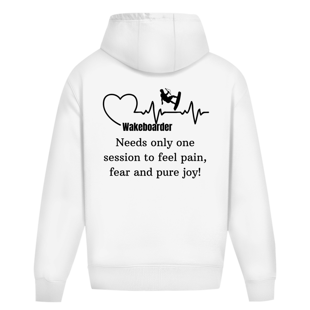 Der Oversize-Hoodie mit dem Rückenprint „Wakeboarder – Needs only one session to feel pain, fear and pure joy!“ feiert genau das Gefühl, das jeder Rider kennt. Ob du deinen ersten Trick stehst oder nach dem dritten Sturz trotzdem lachst – dieser Hoodie bringt deine Leidenschaft auf den Punkt. 🏄♂️💥